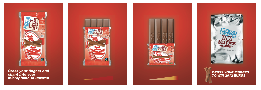 Interactive Banner. By singing or chanting into your computer microphone for 20.12 seconds, the Kit Kat unwraps to reveal if you are a winner.