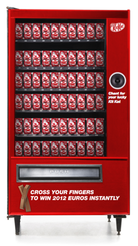 By singing or chanting for 20.12seconds, the vending machine drops a free Kit Kat.